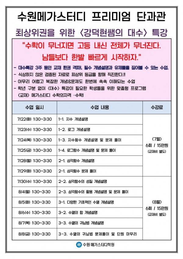2025 중등부 여름방학 수학특강(대수 특강) 페이지 정보 작성자 최고관리자 작성일 25-06-19 17:45 조회 415회 댓글 0건 본문 2025 중등부 여름방학 수학특강(대수 특강)