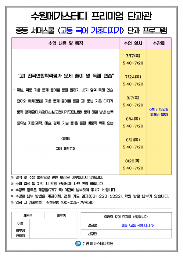 2025 중등부 여름방학 국어 특강(고1 국어 전국연합학력평가 특강) 페이지 정보 작성자 최고관리자 작성일 25-06-19 15:24 조회 402회 댓글 0건 본문 여름방학 국어 고1 모의고사(전국연합학력평가) 특강 안내